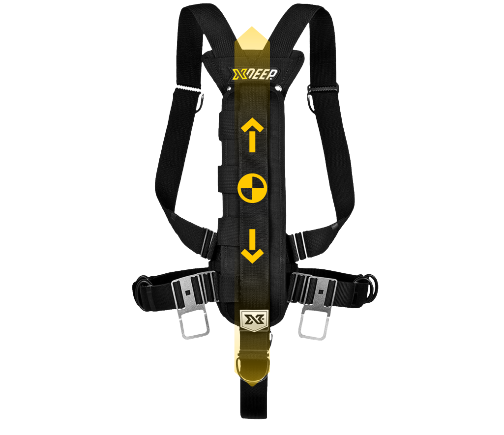 Unlike single piece harnesses the STEALTH 2.0 has independent adjustment of the shoulder and waist straps. Changing the shoulder strap length does not change the waist D ring positions. The crotch strap is an independent adjustment. It is fast and simple to obtain the perfect fit and configuration for multi cylinder diving.