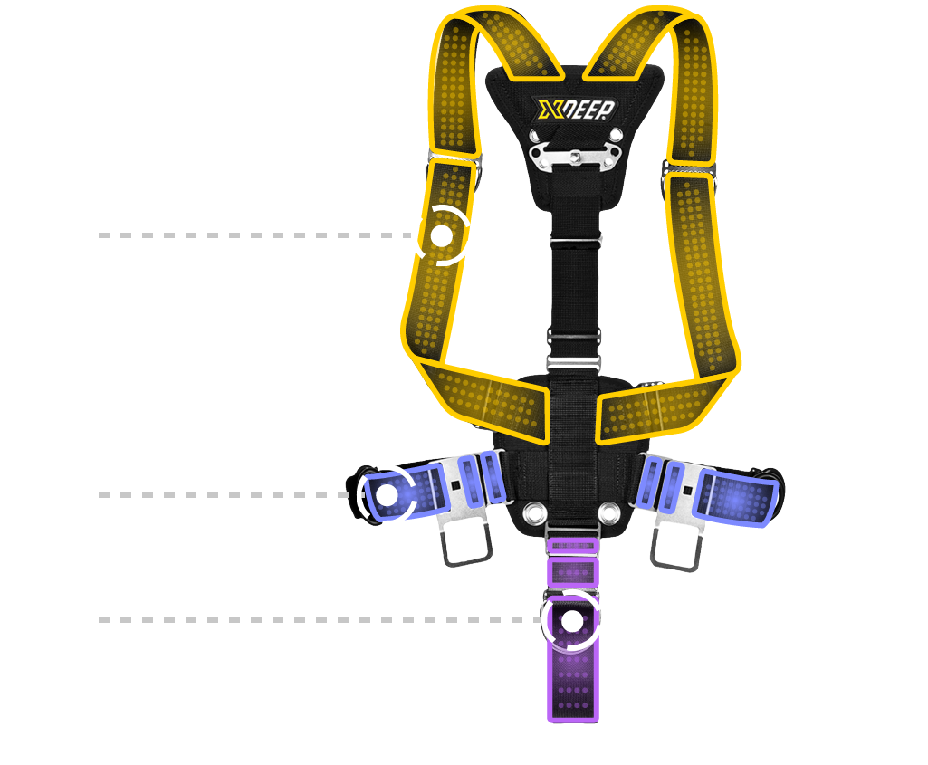 On the waist there is a stiff and rigid webbing that ensures the D rings for clipping off your cylinders stay exactly where you want them, even with stages or deco cylinders. Shoulder straps mould to your body by using softer material and give great fit and ease of movement. The crotch strap is super soft but supportive without leading to wear on your drysuit.