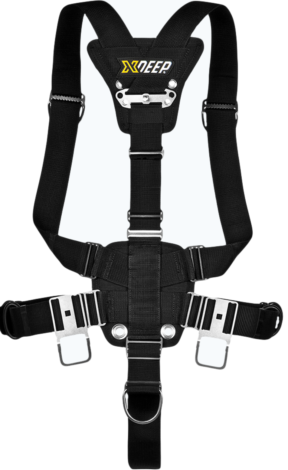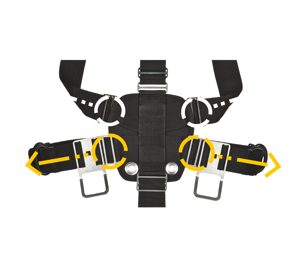 Unlike single piece harnesses the STEALTH 2.0 has independent adjustment of the shoulder and waist straps. Changing the shoulder strap length does not change the waist D ring positions. The crotch strap is an independent adjustment. It is fast and simple to obtain the perfect fit and configuration for multi cylinder diving.